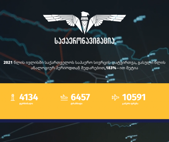 ივლისში საქართველოს საჰაერო სივრცეში 6,457 ტრანზიტული ფრენა განხორციელდა, რაც 2019 წლის მაჩვენებლის დაახლოებით 77% და 2020 წლის მაჩვენებელზე 114%-ით მეტია.