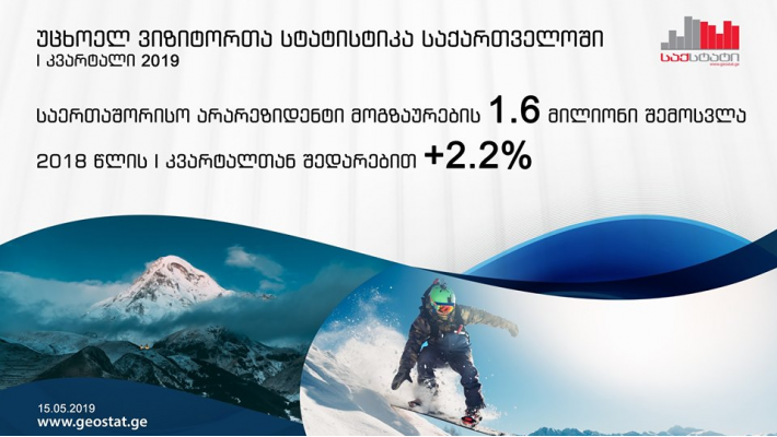 სტატისტიკის ეროვნული სამსახურის მონაცემებით, 2019 წლის პირველ კვარტალში საქართველოს ტერიტორიაზე დაფიქსირდა საერთაშორისო არარეზიდენტი მოგზაურების 1.6 მილიონი შემოსვლა, რაც 2.2 პროცენტით მეტია წინა წლის ანალოგიურ მაჩვენებელთან შედარებით.