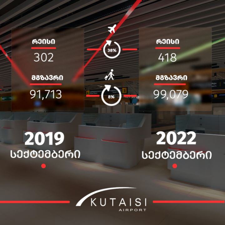 მგზავრთნაკადის გარდა, სექტემბერში, ქუთაისის საერთაშორისო აეროპორტში ავიარეისების რაოდენობის კუთხითაც ზრდა იყო. სექტემბერში, აეროპორტში რეისები 38%-ით გაიზარდა და 418 რეისს მოემსახურა. ( 2019 წლის სექტემბერი – 302 რეისი).