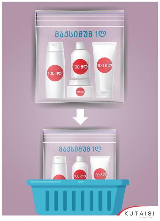 ნებისმიერი სახის თხევადი მასალა (ეს შეიძლება იყოს ჟელე, გელი, კბილის პასტა, კრემი, შამპუნი, ლოსიონი, თხევადი კოსმეტიკა და ა.შ.) ხელბარგში დაშვებულია მაქსიმუმ 100 მილილიტრიანი კონტეინერებით ცალ-ცალკე (ჯამში მაქსიმუმ 1 ლ. მოცულობის სითხე).