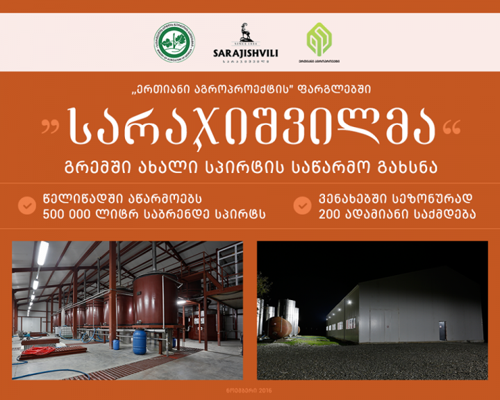 “სარაჯიშვილი დისტილერი“ სახელმწიფოს მხარდაჭერით, „შეღავათიანი აგროკრედიტის პროექტის“ ფარგლებში აშენდა.