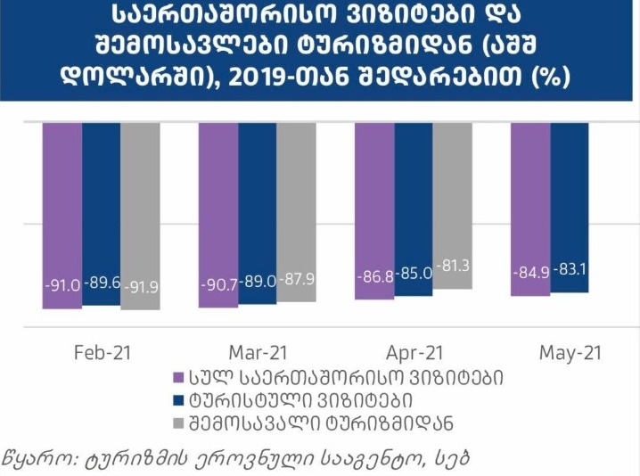 2019 წლის იმავე თვესთან შედარებით, აპრილში 85%-იანი კლების შემდეგ, ტურისტული ვიზიტები მაისში 83.1%-ით შემცირდა. სავარაუდოდ, ტურისტული შემოსავლების ჭრილში, აღდგენა კიდევ უფრო მნიშვნელოვანი იყო.