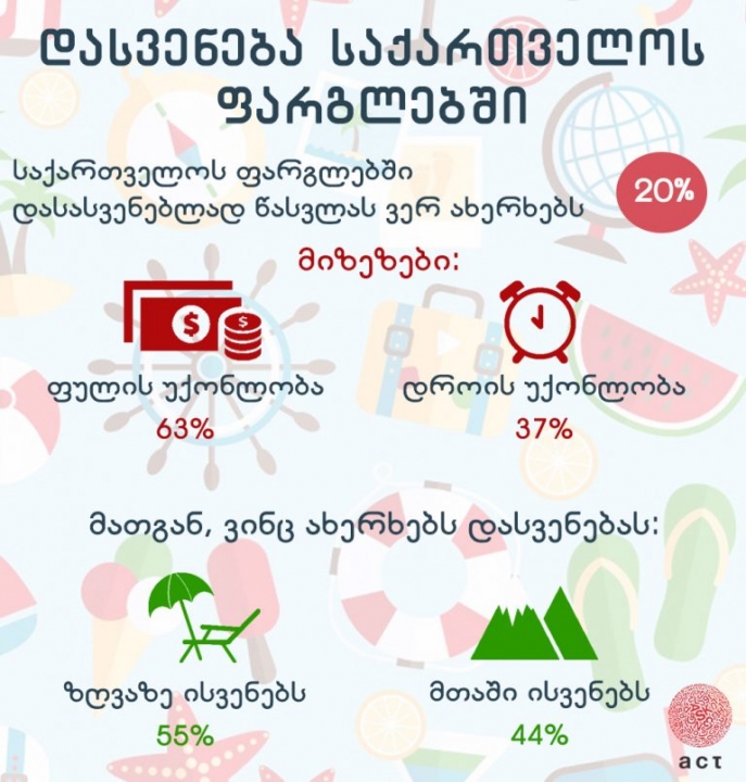 ACT კვლევაში მითითებულია, რომ საქართველოს ფარგლებში დასასვენებლად ვერ წასვლის მიზეზებს შორის ყველაზე აქტუალური ფულის უქონლობაა(63%), მას მოსდევს დროის უქონლობა 37%-ით. დროის უქონლობის განმაპირობებელი ყველაზე მეტად 35-44 წლის გამოკითხულთათვის აღმოჩნდა (73%), ფულის უქონლობის გამო, ყველაზე მეტად დასვენების შანსი არ ეძლევათ 65 წელს ზევით რესპოდენტებს (73%).