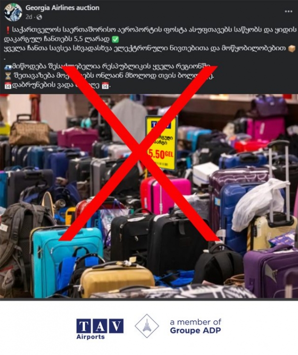 „გვსურს, გამოვეხმაუროთ დეზინფორმაციას, რომელიც სოციალურ ქსელში სხვადასხვა ყალბი გვერდის მეშვეობით ვრცელდება, თითქოს თბილისის საერთაშორისო აეროპორტის დაკარგული და მოუკითხავი ბარგის განყოფილებაში (Lost & Found) მოხვედრილი ნივთები აუქციონზე იყიდება.