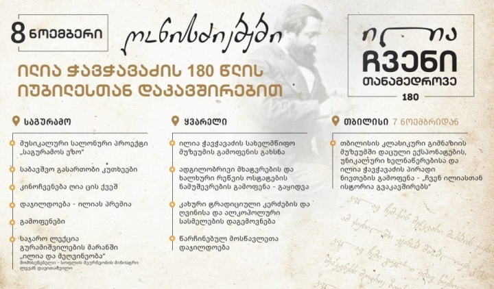 „ილია – ჩვენი თანამედროვე“ – ამ სლოგანით, ილია ჭავჭავაძის 180 წლის იუბილესთან დაკავშირებით, საქართველოს მთავრობის ორგანიზებით, თბილისში, საგურამოსა და ყვარელში, სხვადასხვა ღონისძიება გაიმართება.
