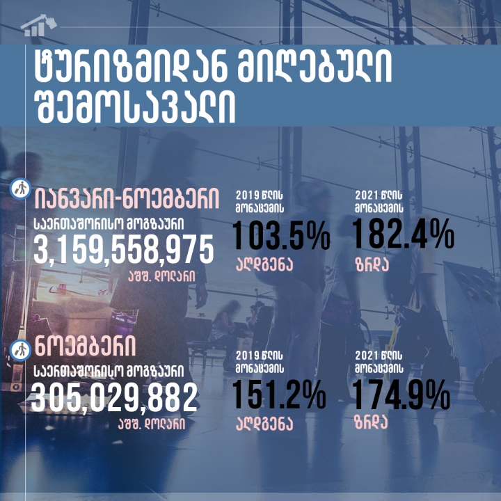 უწყების ცნობით, 2022 წლის იანვარი-ნოემბრის თვეში მოგზაურობიდან მიღებულმა შემოსავალმა გადააჭარბა 2019 წლის მაჩვენებელს და რეკორდული მაჩვენებელი - $3,159,558,975 დაფიქსირდა, რაც 2019 წლის ანალოგიურ მაჩვენებელს 103.5%-ით აღემატება. (ზრდა +108,134,426 აშშ დოლარი). 2021 წლის იანვარი-ნოემბრის თვესთან შედარებით მოგზაურობიდან შემოსავლები გაზრდილია +2,040,668,275 (+182.4%) აშშ დოლარით.