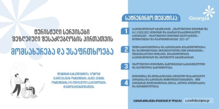 საქართველოს ეკონომიკისა და მდგრადი განვითარების სამინისტროს ტურიზმის ეროვნული ადმინისტრაცია შიდა ტურიზმის ხელშეწყობის და მომსახურების ხარისხის გაუმჯობესების მიზნით ახალ პროექტს იწყებს, ამ ეტაპზე დაიგეგმა ტრენინგი – „შეზღუდული შესაძლებლობის მქონე პირებისათვის ტურისტული სერვისები – მომსახურება და უსაფრთხოება“