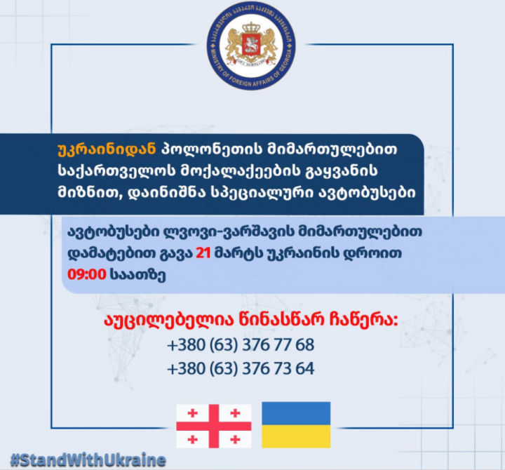უწყების ცნობით, საქართველოს მოქალაქეების გაყვანის მიზნით, მთავრობამ მიიღო გადაწყვეტილება და საგარეო საქმეთა სამინისტროს კოორდინირებით, დაინიშნა ავტობუსის სპეციალური რეისები ქ. ლვოვიდან.