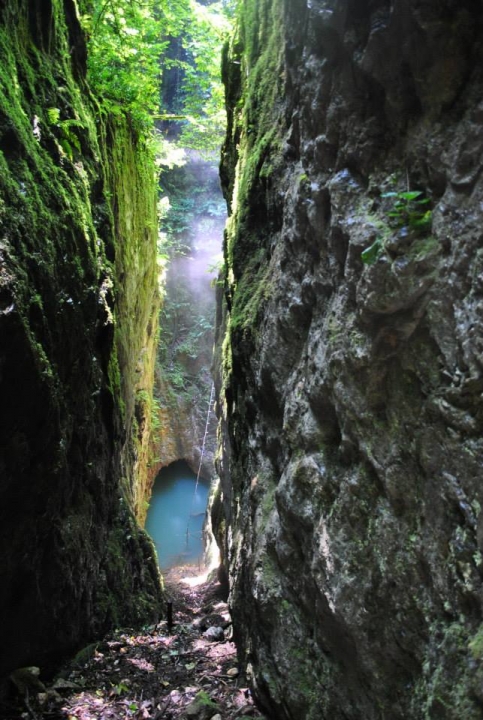 ღირსშესანიშნაობა: ბუნების ძეგლი გამომუშავებულია ქვედაცარცულ კირქვებში, შახტი ფართო ნაპრალის სახით ფოთლოვანი ტყით დაფარულ ფერდობზე იხსნება. ჩრდილოეთისკენ გაწოლილი ნაპრალის სიგრძე 60 მ აღწევს, სიგანე 2-25 მ-ია. ნაპრალის ფსკერზე, ზედაპირიდან 25 მ სიღრმეზე 45 მ სიღრმის სიფონური ტბა მდებარეობს. ნაპრალური სიფონი მღვიმური სისტემის ერთ-ერთი შემადგენელი ნაწილია. სიფონური ტბის დონე მდ. ყუმის გამოსასვლელების დონეს ემთხვევა.