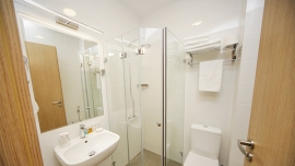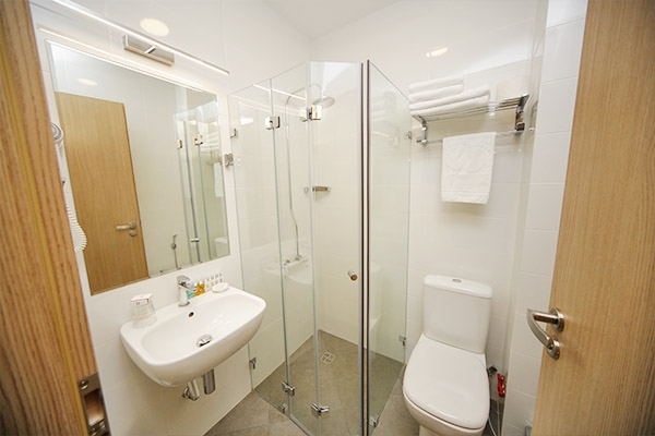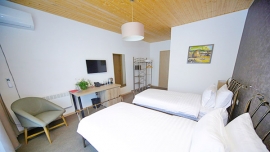 სააბაზანო ოთახი გაწყობილია თანამედროვე იტალიური სანტექნიკით, მინებიანი საშხაპე კაბინით, თმის საშრობი ფენით, ხალათებით. ნომრის ფანჯრები პირდაპირ უყურებს კლდეში ნაკვეთ ქალაქ ვარძიას.