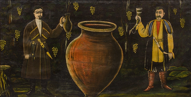 Герои картины в парадных одеждах стоят у марани — винохранилища. Они c гордостью демонстрируют гигантский кувшин: его покупка была целым событием. Панно украшено виноградными гроздьями, как грузинская скатерть — орнаментом. Виноград символизирует благополучие и богатство. Черный фон картины можно принять за краску, но это естественный цвет клеенки, чьи живописные свойства художник так ценил .