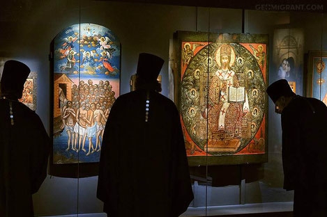Это большое событие". По его словам, самые ранние памятники русской иконописи, представленные на выставке, относятся к XIV веку — иконы архангелов Михаила и Гавриила. В коллекцию музея вошли египетский фаюмский портрет, прародитель древнейших произведений иконописи; палестинская мозаика (V-VI века); византийская икона Рождества Христова (конец XIV — начало XV века); литые иконы из Византии, Грузии и Малой Азии (V-XII века); потир (XII век); редкий по иконографии образ святого великомученика Георгия Победоносца с "двойным чудом" (XVI век); икона Богоматери Палестинской с Младенцем (Сиенская школа, XIV век). Завершает экспозицию триптих, написанный Виктором Васнецовым для Всемирной выставки в Париже 1899 года,— Господь Вседержитель, Богоматерь с Младенцем и святая равноапостольная великая княгиня Ольга.
