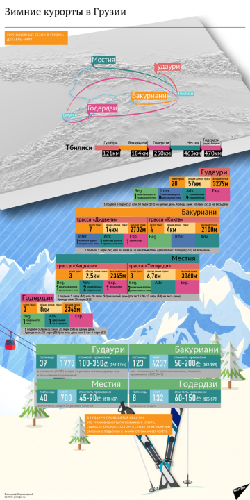 Зимний сезон в Грузии открывается в начале декабря и длится до середины марта. О стоимости отдыха, горнолыжных базах, протяженности и сложности трасс можно узнать из нашей инфографики.