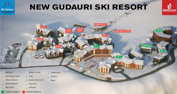 Компания ‘’Рэд-ко’’ владеет 50 гектарами земли в Гудаури, обустраиванием которой занималась канадская компания ‘’Экозаин‘’, которая занимается проектированием горнолыжных курортов по всему миру. По проекту до 2026 года в Гудаури будут построены до 26 различных типов жилых комплексов, гостиниц, рекреационных и развлекательных объектов. Согласно этому плану, компания ‘’Рэд-ко’’ уже построила и открыла 5 апарт-отелей, что дает возможность частным лицам купить и при желании сдавать апартаменты. Это становится все более актуальным с нынешними темпами роста популярности курорта.