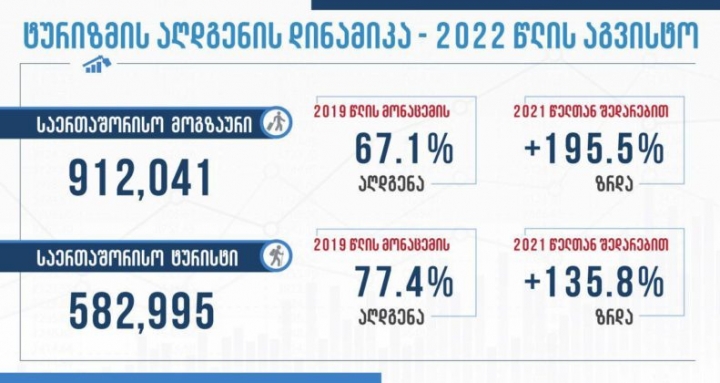 В целом, за январь-август 2022 года Грузию посетили 3 256 370 международных путешественников. По сравнению с аналогичным периодом 2021 года рост составляет почти 210%. По сравнению с данными за восемь месяцев 2019 года показатель восстановления посещений составил 51,5%.
