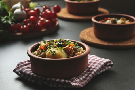 Баклажаны крупно нарезать, посолить, оставить на 20 минут, после чего промыть и слегка отжать. Лук и картофель очистить. У перцев удалить сердцевину. С помидоров снять кожицу. Нарезать все овощи крупными кусками. Измельчить зелень. Чеснок очистить и раздавить или порезать.