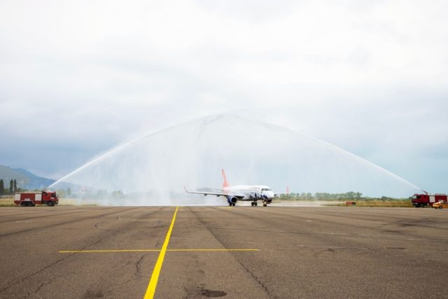 В пятницу первым рейсом в летнюю столицу Грузии прибыли около сотни туристов. В аэропорту Батуми судно встречали традиционной водной аркой и фольклорным шоу.