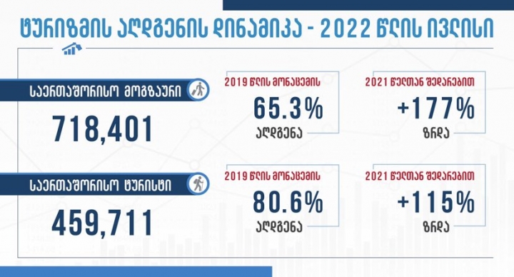 Согласно статистике Национальной администрации туризма, только в июле число международных туристических визитов в Грузию достигло 459 711, что составляет чуть более 80% от уровня 2019 года. Рост по сравнению с июлем 2021 года составил 115%.