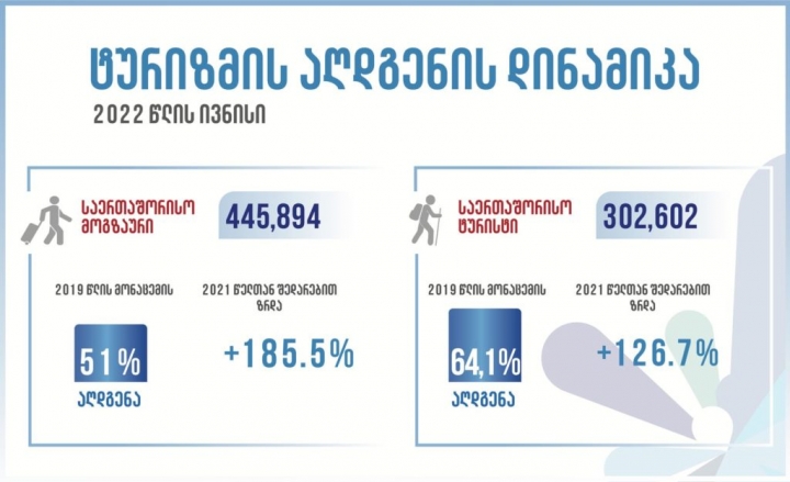 Согласно статистике Национальной администрации туризма, только в июне Грузию посетили 445 894 международных путешественников, что составляет чуть более половины от уровня 2019 года. Рост по сравнению с июнем 2021 года составил 185,5%.