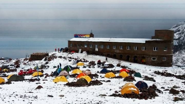 Фотографии первого снега сделали туристы, расположившиеся на Метеостанции – это заброшенное здание советских времен, близ которого альпинисты устанавливают палатки. Метеостанция находится на высоте 3 700 метров.