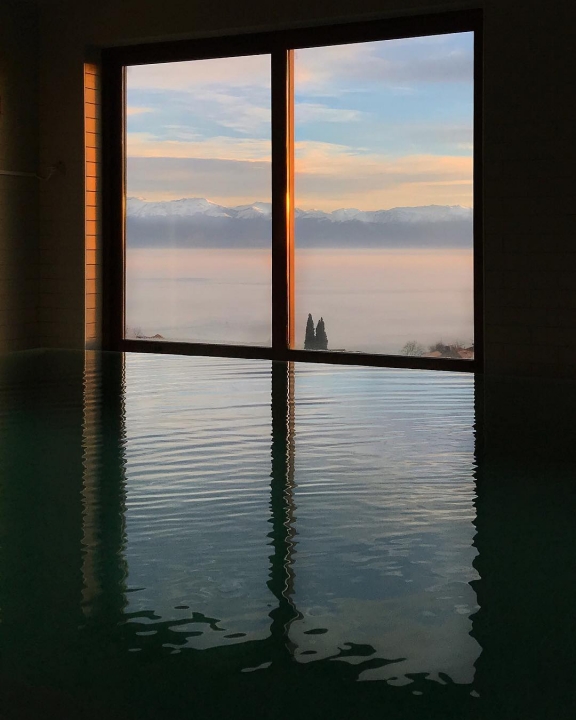 На снимке бассейн в отеле почти сливается с видом на туманную долину и заснеженные горы Кавказского хребта. Фото подписано так: «Небольшие детали придают характер».