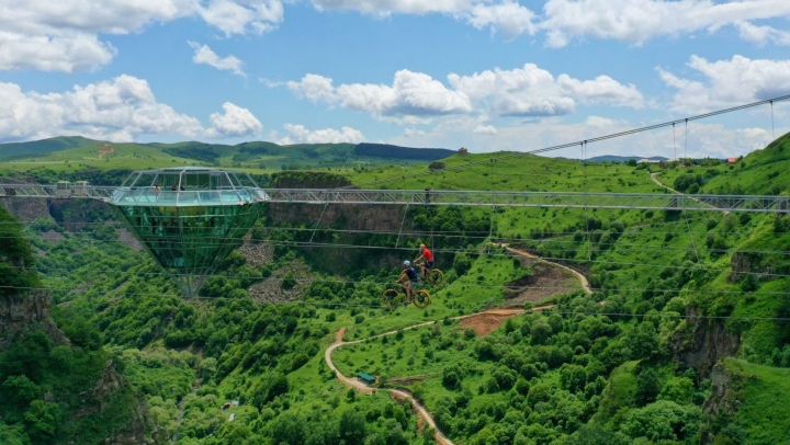 Прогулка здесь – настоящее приключение. Над каньоном устроены навесные мостики, которые на многих участках прозрачные. Их общая протяженность – 780 метров. В конце маршрута – смотровая площадка, откуда открываются потрясающий вид на ущелье реки Лухумела. Дорога до мостиков занимает около часа пешком и проходит через красивый парк Дадиани.