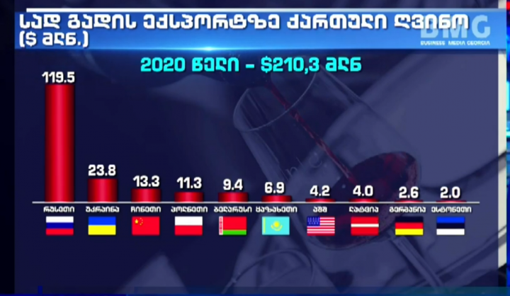 В целом за восемь месяцев 2021 года в денежном выражении экспорт вина, бренди, чачи, виноматериалов, разливного бренди и спирта для бренди составил порядка 234 миллиона доллара, что на 18% больше показателя аналогичного периода прошлого года.