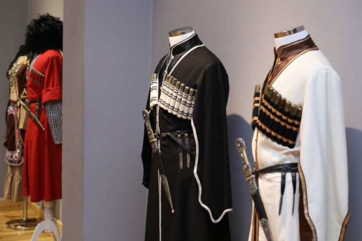 На одном из них – реконструкция платья царицы Мариам Дадиани, правившей в Картли в начале XVI века. Узор костюма воссоздан по фреске в храме Светицховели. Каландия говорит, что художник-дизайнер Екатеринв Гегучадзе вручную раскрашивала шелк, «в точности так, как это делали наши предки много веков назад»