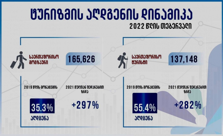 Число международных туристических визитов в Грузию в феврале составило 137 148. Уровень допандемийного февраля 2019 года восстановлен на 55,4%. По сравнению с аналогичным периодом 2021 года отмечен рост в 282%.