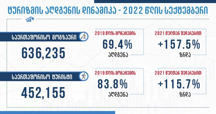 Согласно отчету, за январь-сентябрь Грузию посетило 3 892 605 иностранных путешественников. По сравнению с 2019 годом количество международных туристических посещений в Грузии восстановилось на 83,8%, а количество посещений международных путешественников — на 65,3%.