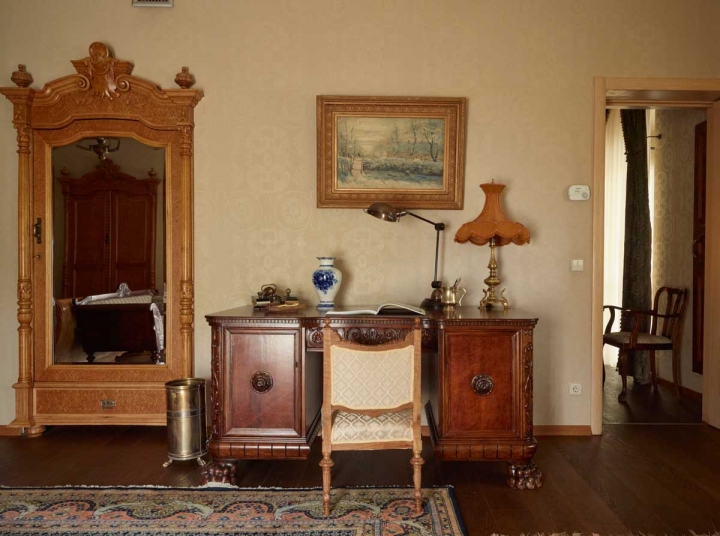 Роскошный 100 кв. м. люкс включает в себя хамам (парная сауна), антикварный французский камин, уникальную античную деревянную мебель «Птичий глаз» и мебель из орехового дерева, звуконепроницаемые окна, затемняющие шторы, полы из твердой древесины, рабочий стол, два стола, диваны, два кресла, гардеробы/шкафы и два широких балкона с красивым видом на реку Куру и сад, кровать шириной в два метра, раскладной в двухместную кровать диван, обе кровати с матрасами из чистого латекса, вручную украшенные стены. Эта комната идеально подходит для семьи или любого, кто ищет роскошь и пространство: просторная ванна, отдельный душ и туалет для гостей рядом с хамамом.